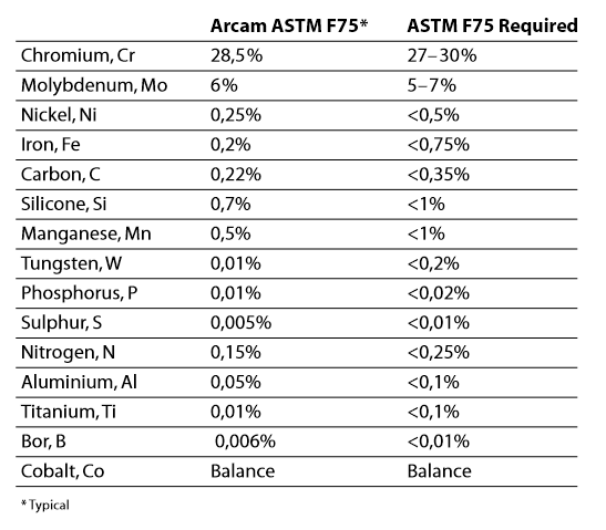 如下表1. 有關(guān)Arcam ASTM F75 與ASTM F75的比較表,注意到余量是鈷元素。
