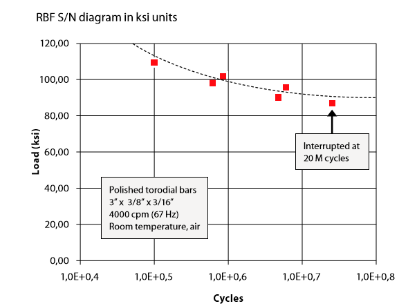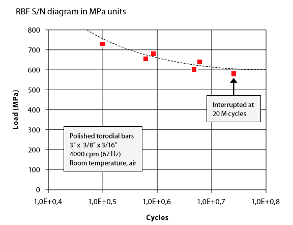 圖2. Arcam ASTM CoCr F75耐疲勞測試的標(biāo)準(zhǔn);上圖為公制MPa;下圖為美制KSI
