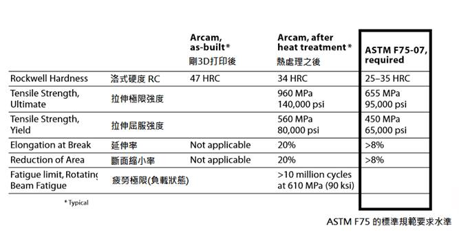 如下表2. 有關(guān)Arcam ASTM F75 與ASTM F75的機(jī)械性能比較表