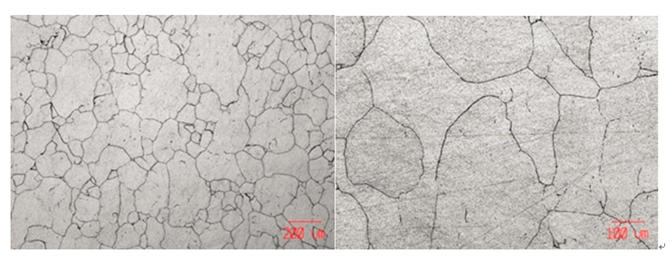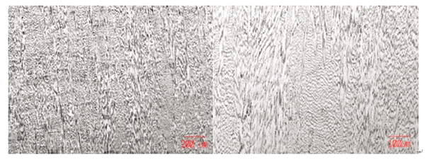 圖4.經(jīng)熱處理后的零件Z方向截面的微結(jié)構(gòu);左50x(紅色尺標(biāo)顯示200um)、右 100x(紅色尺標(biāo)顯示100um)