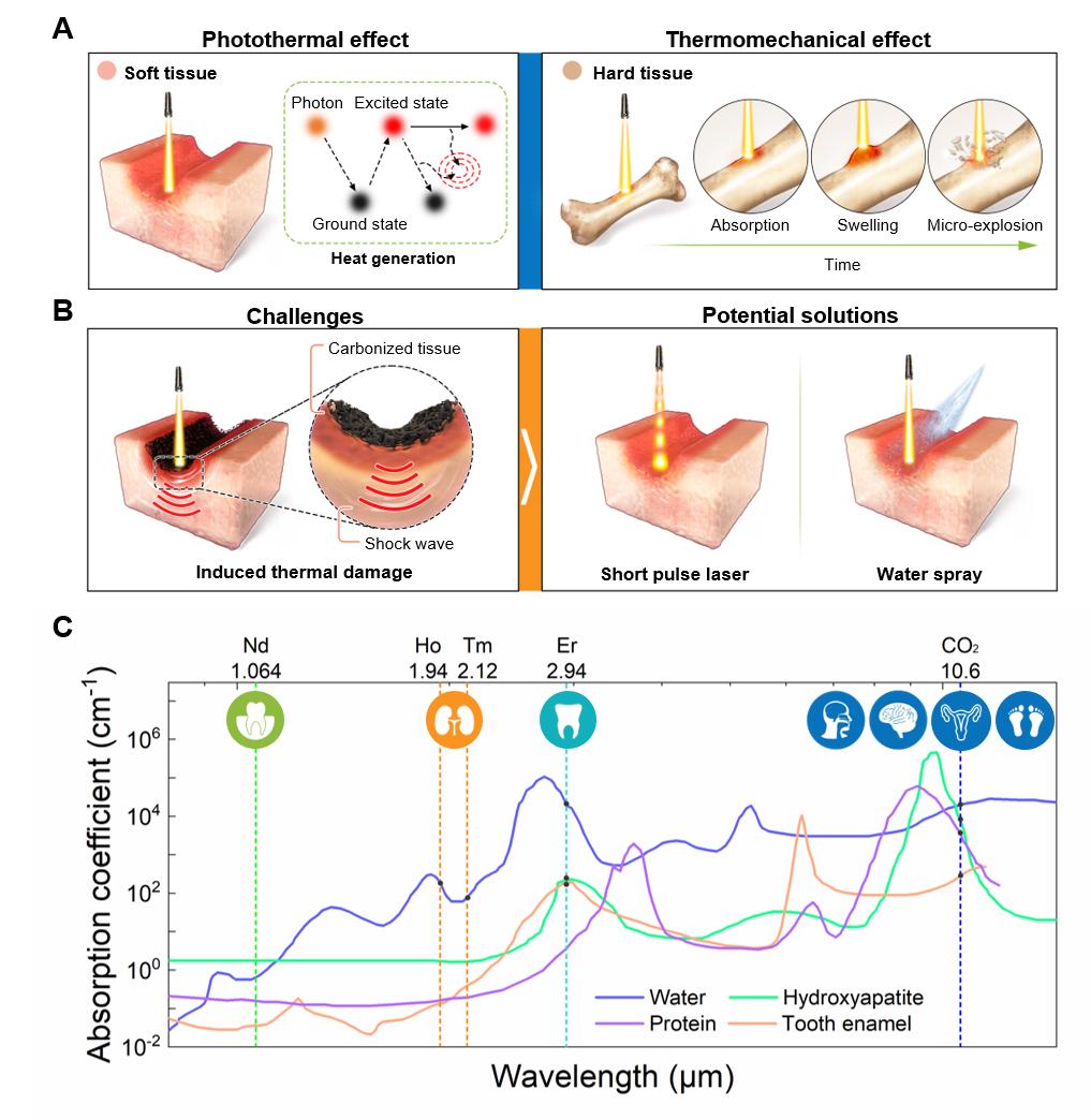 與基于機(jī)械加工的傳統(tǒng)手術(shù)工具不同,激光手術(shù)刀通過(guò)獨(dú)特的組織光學(xué)作用實(shí)現(xiàn)高效生物組織加工。文章詳細(xì)闡述了針對(duì)軟組織與硬組織切除的光熱消融與光致機(jī)械消融機(jī)理,并討論了水介導(dǎo)和超短脈沖激光技術(shù)在緩解組織凝結(jié)、碳化等熱損傷方面的研究進(jìn)展(圖1)。進(jìn)一步地,文章分析了以Nd、Ho、Tm、Er和CO2激光為主的紅外醫(yī)療光源在牙科、泌尿外科等多種手術(shù)領(lǐng)域的特點(diǎn)、優(yōu)勢(shì)與應(yīng)用價(jià)值,并強(qiáng)調(diào)新型手術(shù)激光光源技術(shù)的進(jìn)步給激光傳輸介質(zhì)在靈活性、穩(wěn)定性和操控性等方面帶來(lái)的巨大挑戰(zhàn)。
