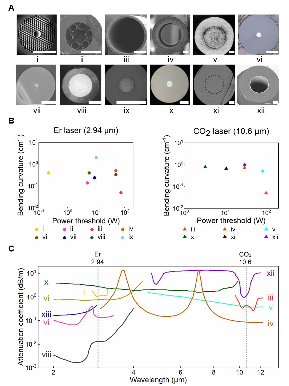 激光傳輸介質(zhì)作為激光手術(shù)刀系統(tǒng)中的關(guān)鍵器件,需要穩(wěn)定地將激光能量遞送至特定手術(shù)部位。文章系統(tǒng)闡述了導(dǎo)光臂、空心波導(dǎo)和紅外光纖三類(lèi)主要醫(yī)用激光傳輸介質(zhì)的研究現(xiàn)狀,并強(qiáng)調(diào)小尺度、高靈活性的紅外光纖器件在微創(chuàng)外科醫(yī)療中的應(yīng)用潛力。文章全面分析了紅外光纖器件的研究進(jìn)展,從激光傳輸閾值、光學(xué)損耗和機(jī)械柔性角度比較了光纖在Er激光和CO2激光中的器件性能(圖2),并指出高光學(xué)損耗和低機(jī)械強(qiáng)度是限制紅外光纖器件在外科手術(shù)中深度應(yīng)用的關(guān)鍵因素。近年來(lái)多材料纖維技術(shù)的快速發(fā)展,不同光、力、電、磁等物理性能的復(fù)合材料高度一體化集成,為開(kāi)發(fā)高柔性低損耗中紅外光纖并進(jìn)一步提升手術(shù)器械功能性提供了可靠研究支撐。