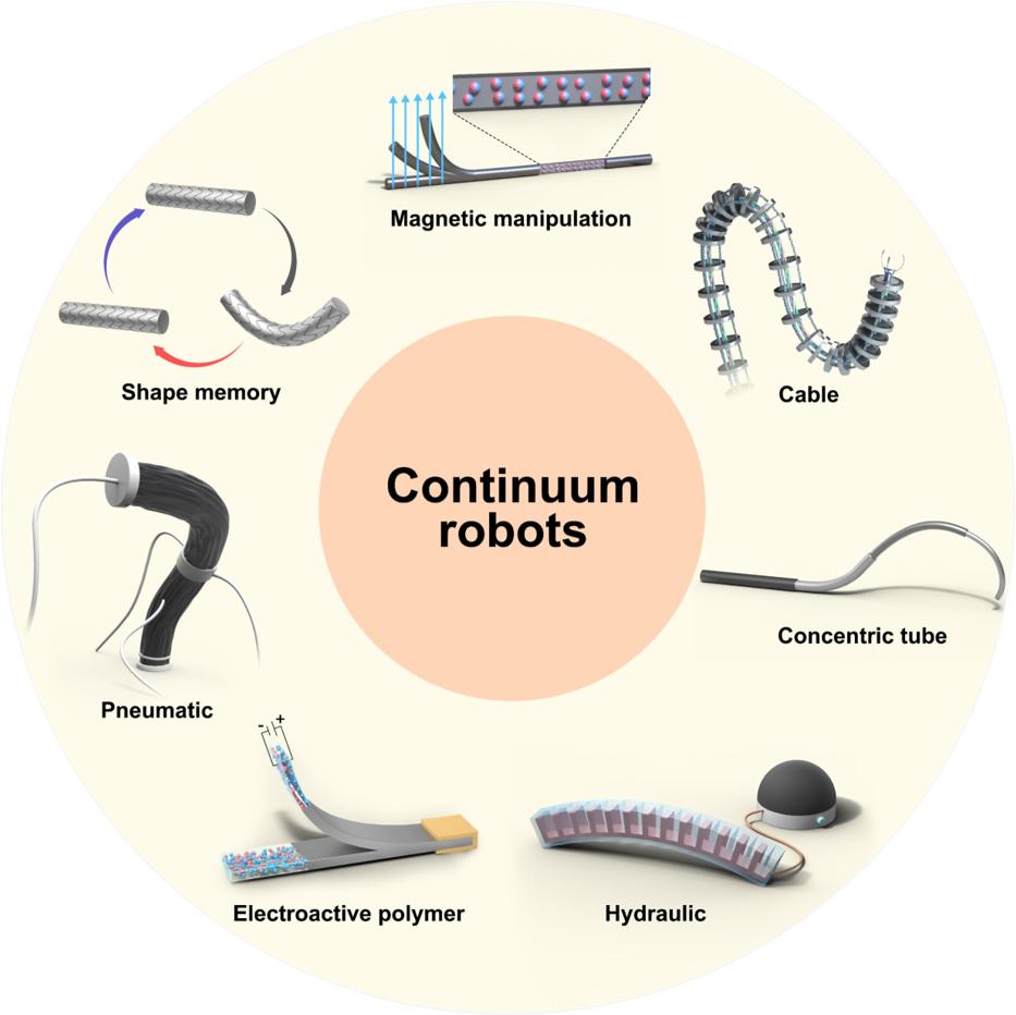 手術(shù)器械的精準(zhǔn)操控是實(shí)現(xiàn)高效微創(chuàng)手術(shù)的重要因素。材料科學(xué)與生物工程學(xué)科的快速發(fā)展,催生了驅(qū)動(dòng)方式多樣的連續(xù)體手術(shù)機(jī)器人研究,促進(jìn)了精準(zhǔn)外科醫(yī)療發(fā)展。文章全面分析了現(xiàn)有連續(xù)體機(jī)器人的驅(qū)動(dòng)機(jī)理與特性(圖3),指出基于磁驅(qū)動(dòng)方式的連續(xù)體機(jī)器人在安全、精準(zhǔn)和智能化外科手術(shù)介入中的巨大潛力。此外,文章進(jìn)一步提出了柔性纖維機(jī)器人激光手術(shù)刀的概念,激光手術(shù)刀與醫(yī)療連續(xù)體機(jī)器人的結(jié)合推動(dòng)了其更為廣泛的臨床應(yīng)用,這些系統(tǒng)已成功應(yīng)用于泌尿外科、婦科和耳鼻喉科手術(shù)。