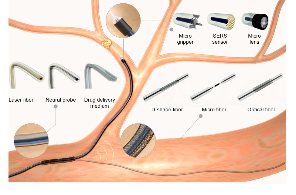 外科手術(shù)器械的創(chuàng)新發(fā)展是驅(qū)動(dòng)精準(zhǔn)外科醫(yī)療技術(shù)快速進(jìn)步的重要因素。激光手術(shù)刀正不斷朝著小尺度、高度靈活、高效率的方向發(fā)展,并通過(guò)與導(dǎo)航操控、定位、成像和信息感知等功能器件深度融合,以滿(mǎn)足更為狹窄、復(fù)雜多樣的手術(shù)環(huán)境需求,在臨床領(lǐng)域取得了諸多突破性進(jìn)展。文章的最后總結(jié)了未來(lái)柔性纖維機(jī)器人激光刀在精準(zhǔn)外科醫(yī)療中的優(yōu)勢(shì)和巨大挑戰(zhàn),并對(duì)該領(lǐng)域的未來(lái)發(fā)展方向進(jìn)行展望(圖5):(1)激光傳輸介質(zhì)的材料、結(jié)構(gòu)與制造,通過(guò)高性能生物相容材料創(chuàng)新與高性能波導(dǎo)結(jié)構(gòu)設(shè)計(jì),結(jié)合先進(jìn)纖維制造手段,實(shí)現(xiàn)穩(wěn)定、高效醫(yī)療激光輸出的柔性激光傳輸介質(zhì)開(kāi)發(fā)。(2)醫(yī)療機(jī)器人的驅(qū)動(dòng)、建模與傳感,面向狹窄的解剖結(jié)構(gòu)空間,深入探究醫(yī)療機(jī)器人驅(qū)動(dòng)機(jī)理與新型結(jié)構(gòu)設(shè)計(jì),實(shí)現(xiàn)精準(zhǔn)、安全的外科診斷與操作。(3)多材料纖維器件的開(kāi)發(fā),為臨床介入提供更為靈活和智能化的手術(shù)工具。(4)光纖尖端微納結(jié)構(gòu)的設(shè)計(jì)與制造,豐富纖維機(jī)器人的多模態(tài)操作策略。(5)光纖側(cè)表面上的分布式傳感,為機(jī)器人提供了精確獲取局部環(huán)境信息的能力。