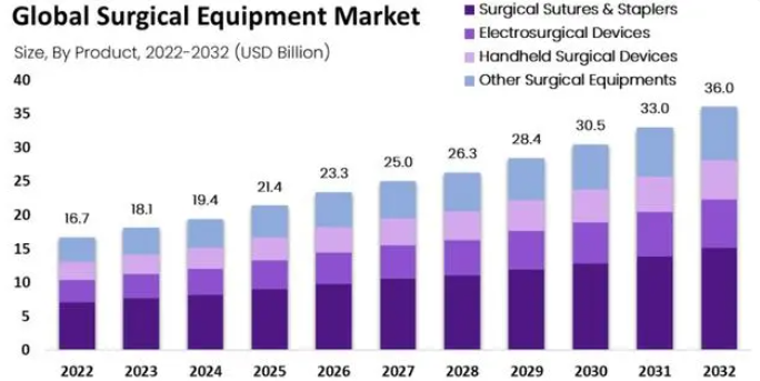 市場(chǎng)增長:手術(shù)設(shè)備市場(chǎng)預(yù)計(jì)到2032年將達(dá)到360億美元,從2022年的167億美元開始計(jì)算,年復(fù)合增長率(CAGR)為8.2%。